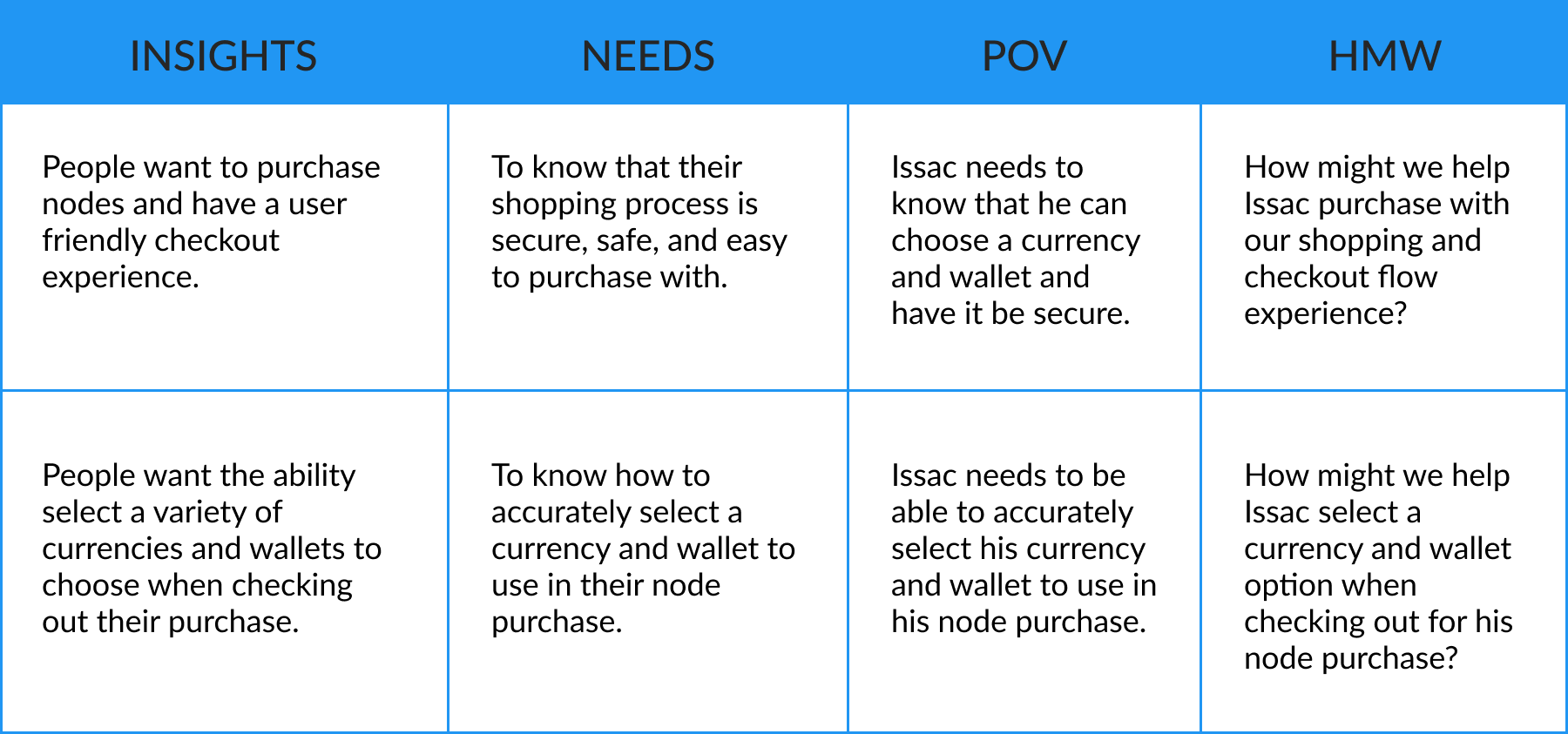 Now with my understanding of our wallet user Issac, I wanted to start thinking about what problems we are trying to solve for him. I started to try and better understand them by creating a point-of-view diagram and a series of questions that would help drive my brainstorming process. On this diagram, I thought about what insights I could understand about the shopping flow process and its checkout experience, what the user’s immediate needs were during the process, what the user’s point of view would be like (and how could I empathize with it), and how might we help the user.