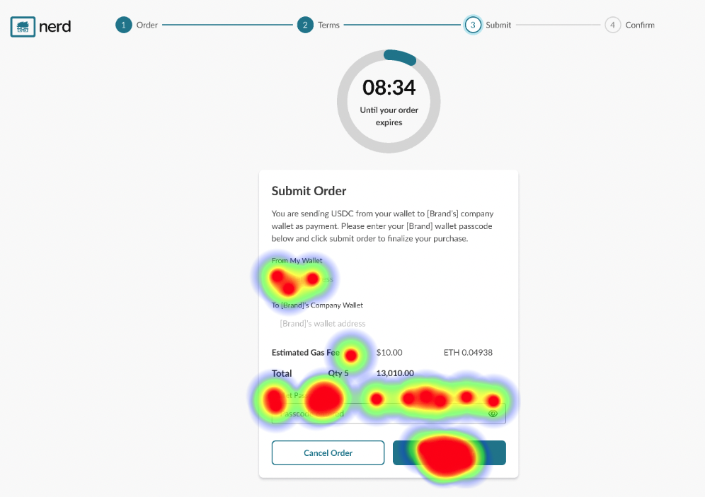 For usability testing, I conducted a Maze test as well as reached out to participants on our research and user testing slack channel. The users were asked to share what they were doing, thinking, and feeling while interacting with the prototype and trying to complete the tasks given to them. I tested the 2 different flows: Add 5 Smart Nodes with USDC currency to your shopping cart, and complete the checkout process for your 5 Smart Nodes with your brand wallet.