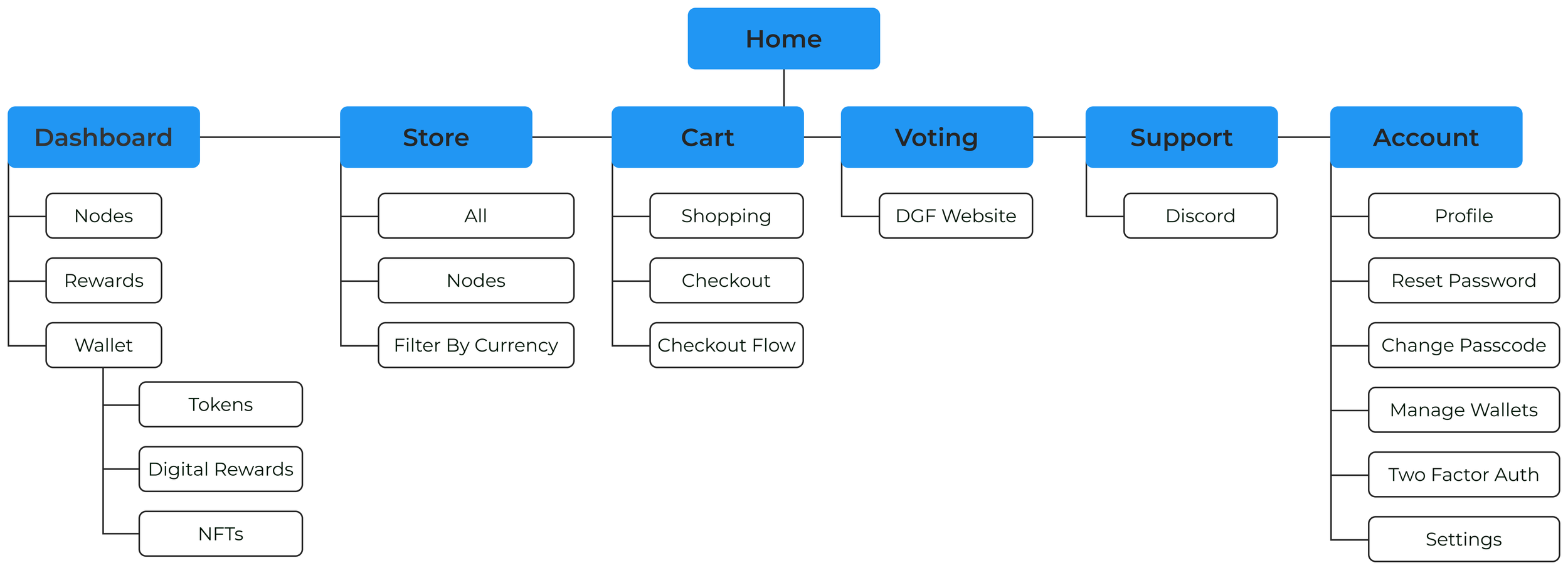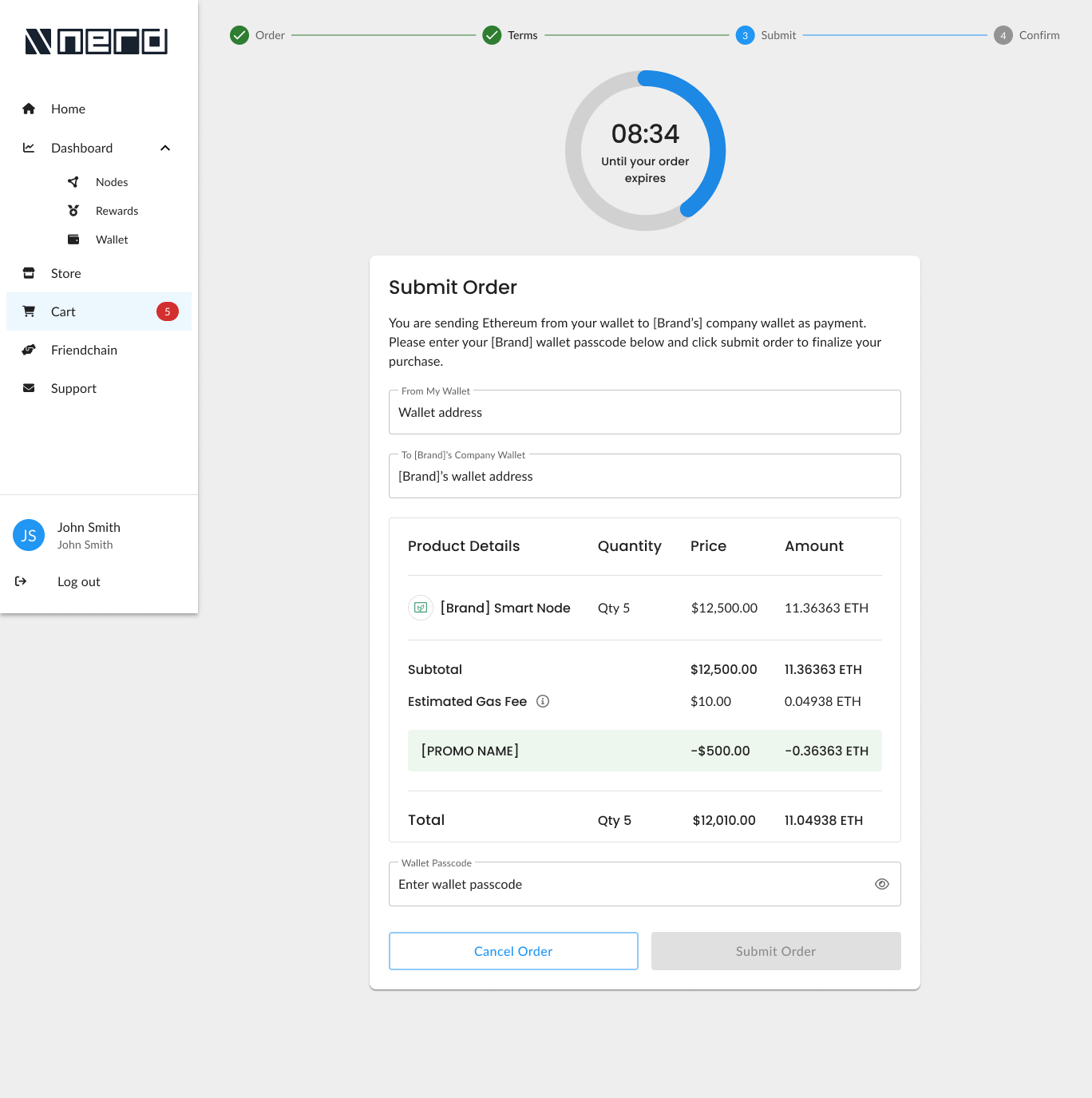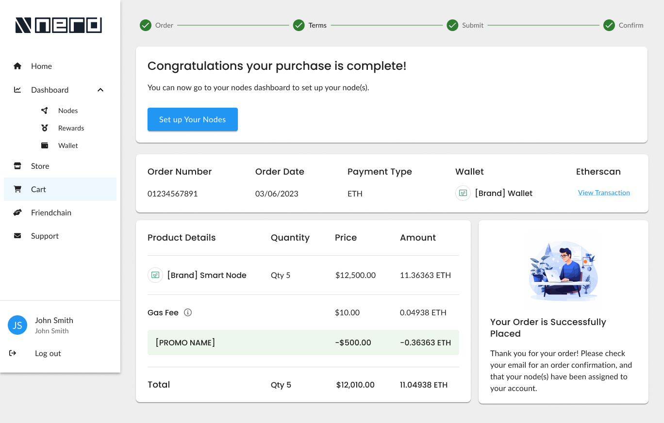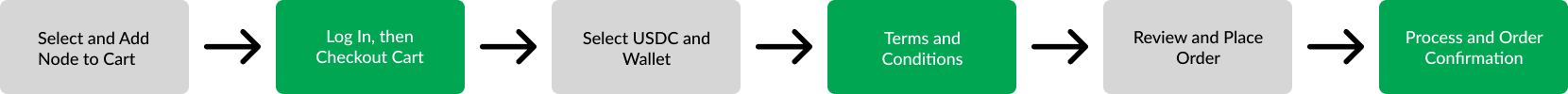 This scenario involved adding a Smart or Lite node to their shopping cart, logging in to the system, going to their shopping cart, and checking out. Throughout the checkout process, they would have selected Ethereum (ETH) as their currency. Once they begin their checkout they would select the wallet of their choice (Brand, MetaMask, External). If they didn’t have their brand wallet set up, a user could select the setup button, go through the setup flow, and be redirected back to their shopping flow. Next, a user would review and sign their terms and conditions. This is an important step per our legal department as it informs the user of the agreements they need to review and sign. After this step, they would submit their order by reviewing it and entering their wallet passcode. Once their passcode was entered they would be taken to a processing order screen and then a confirmation order screen to complete their checkout process.