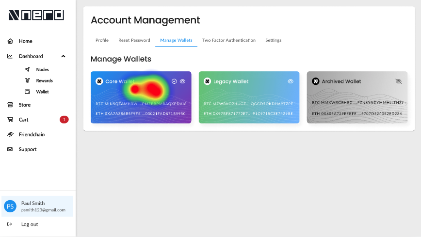 To plan out the site architecture for this application and where the features would fit, I created an application site map (ongoing) to organize the screens in a way that would be logical and intuitive for Winslow. I had explored 2-3 different versions before settling on the current layout, which was chosen based on user onboarding and overall flow considerations. By watching user flow sessions and their heatmaps with Hotjar, I determined that most new users will onboard, set up their wallet and then purchase node(s). Because of this, I chose to design a top-level navigation in our dashboard that would allow a user to access their nodes dashboard, rewards overview, and wallet.