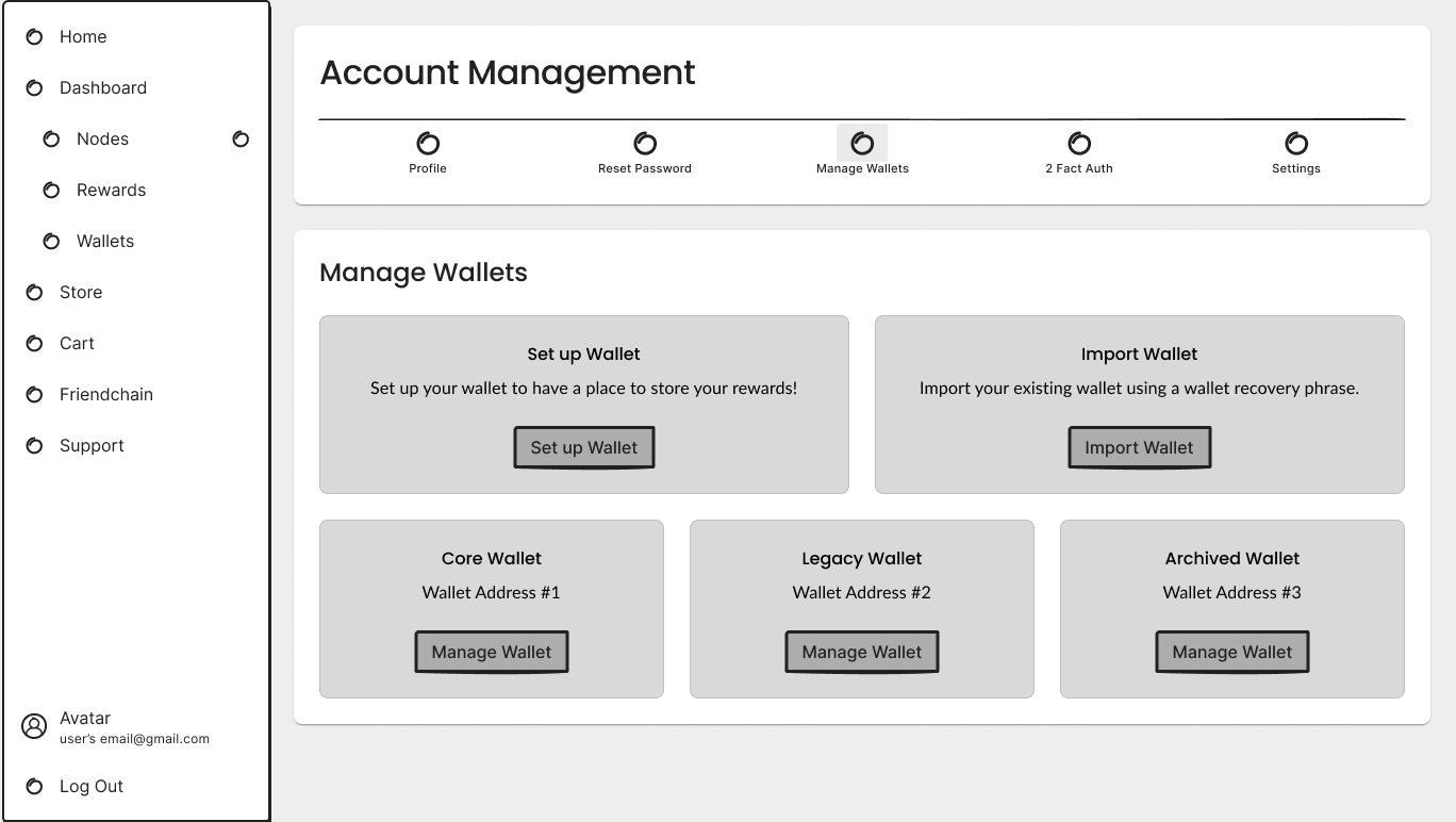 I worked on making informed decisions on designing the initial wireframes for this project. Initially there was functionality to manage certain aspects of the wallet, and having the ability to set up and import wallet on the Manage Wallets tab. Over time this would be revised as business needs and certain functionality would become more clear (showcasing multiple wallets or just giving the user the ability to view the Core wallet on the client side UI). At the time, it met the needs of Winslow as she could set up, or import a wallet, and view multiple wallets (Core, Legacy, Archived) from the Manage Wallets tab. Since the flow for setting up a new wallet already existed I didn’t wireframe for that or importing and replacing a wallet.