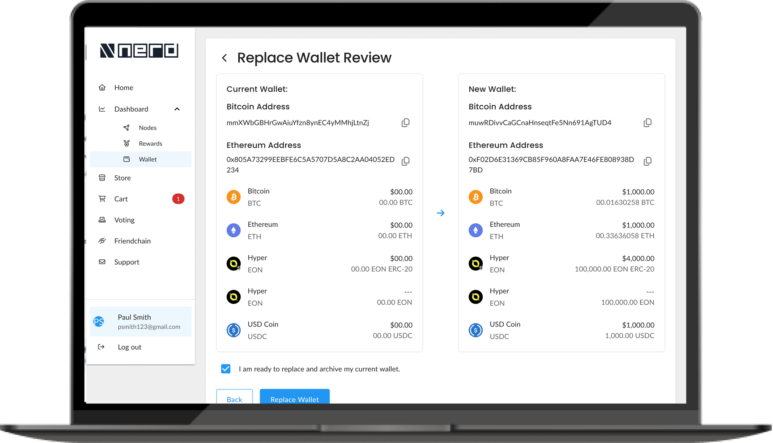 Winslow would select the brand wallet and select replace wallet from the ellipses menu. She would view a splash screen where she had to review and agree to the steps she was about to take, then be prompted to enter her current passcode. Next she would be prompted to enter her 12-word mnemonic phrase and select continue CTA button. She would review her wallet balances and confirm that the tokens had been transferred and click the replace wallet CTA button. A success modal would appear and she would be redirected to her wallet dashboard.